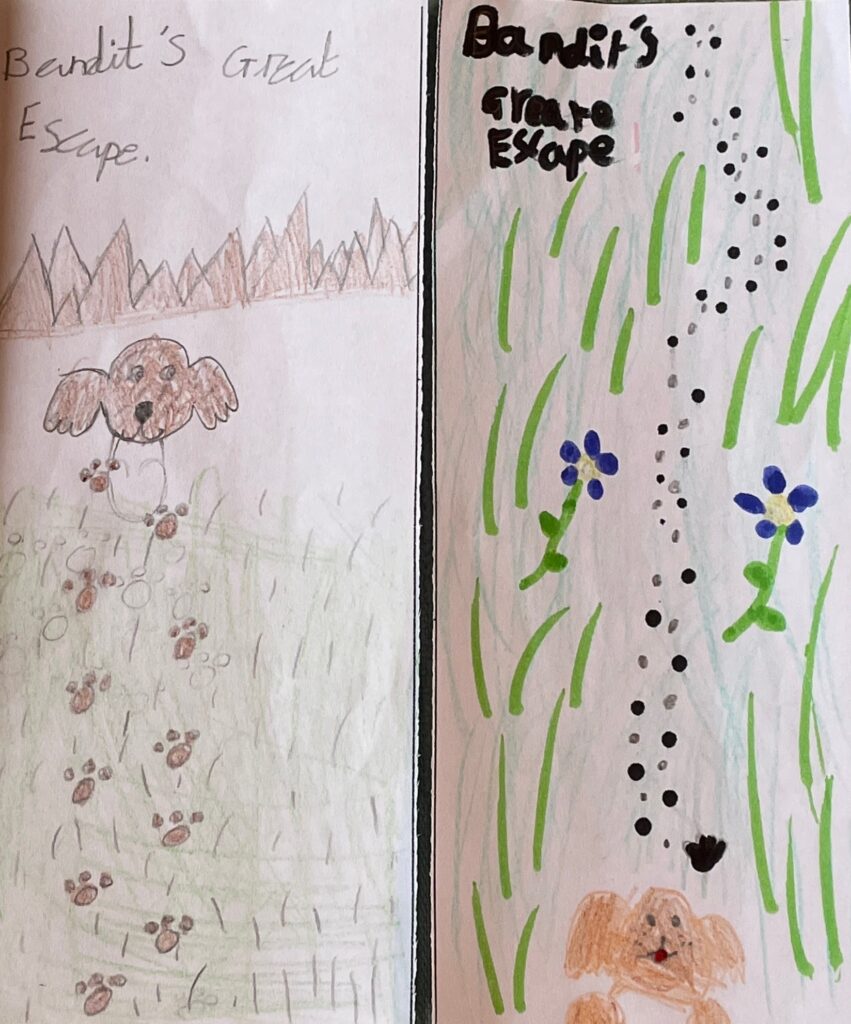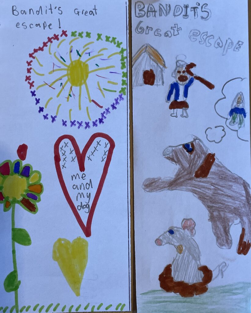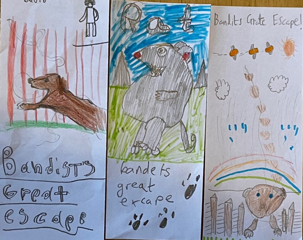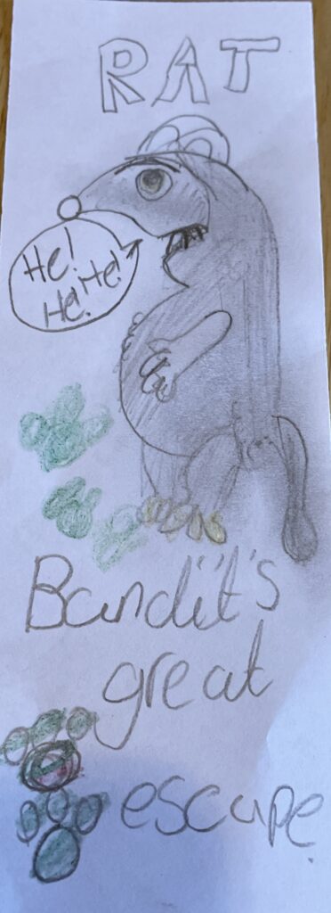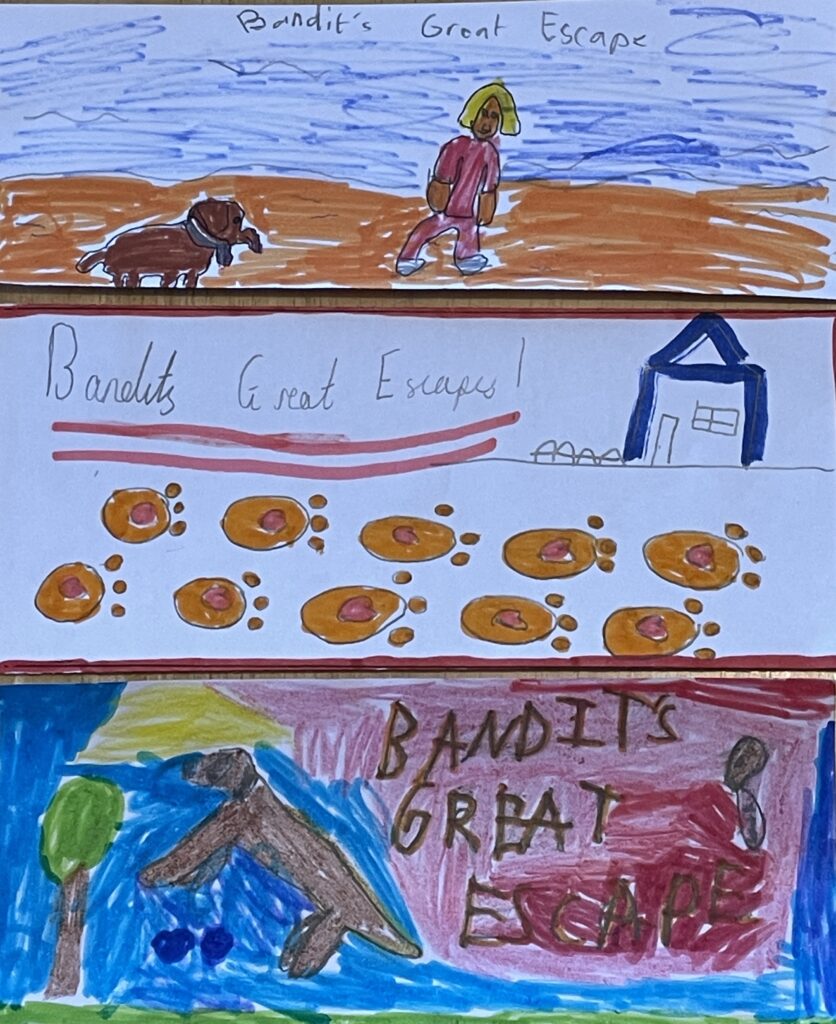 I love the action in David's drawing; Niamh's expressive, fun rat; and the rainbow that Mason has drawn over Bandit who is escaping through the open gate.