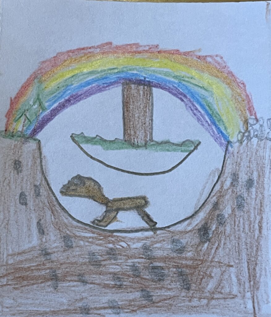 William has created this imaginative drawing of Bandit tunnelling under a wonderful rainbow overhead!